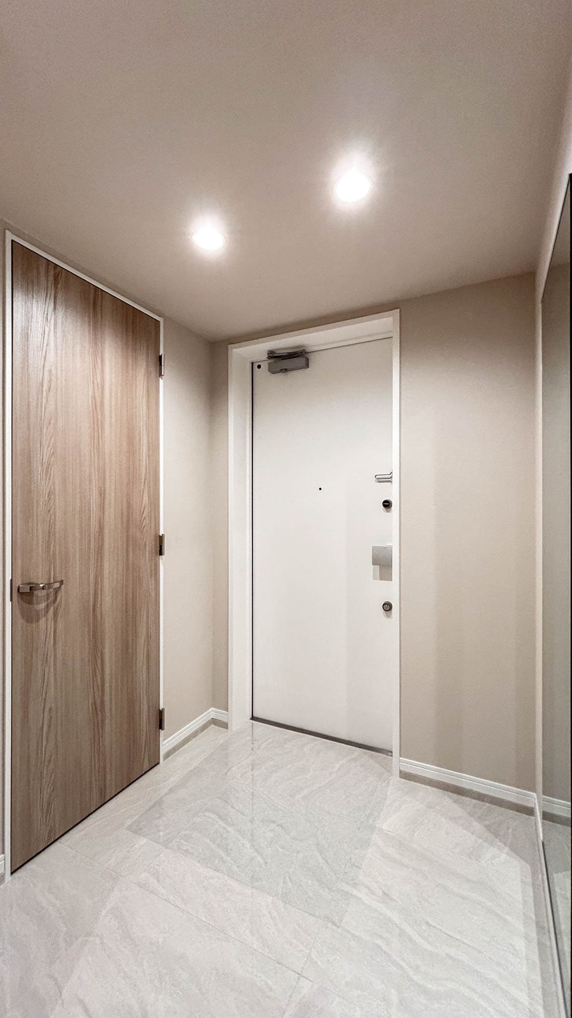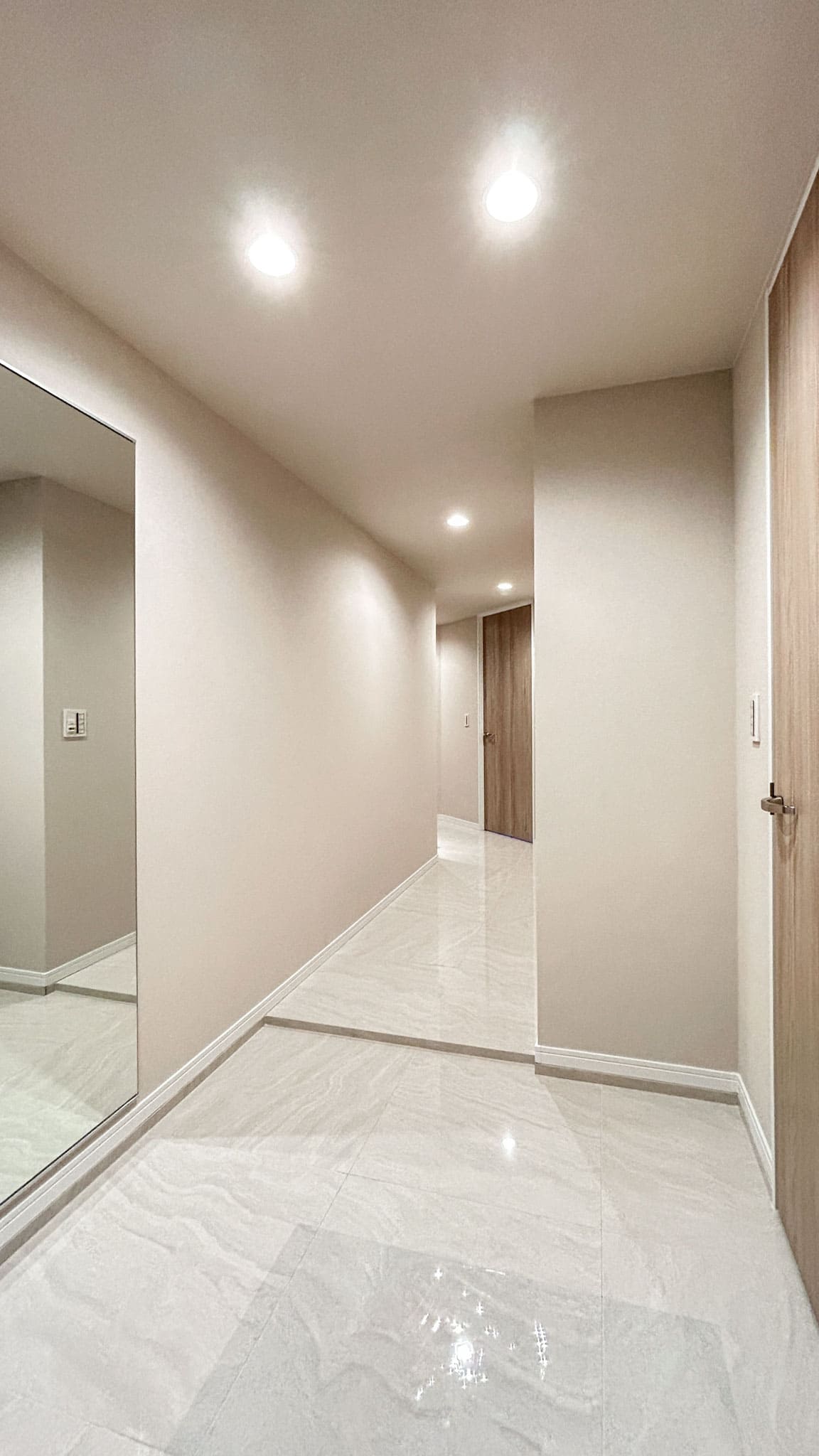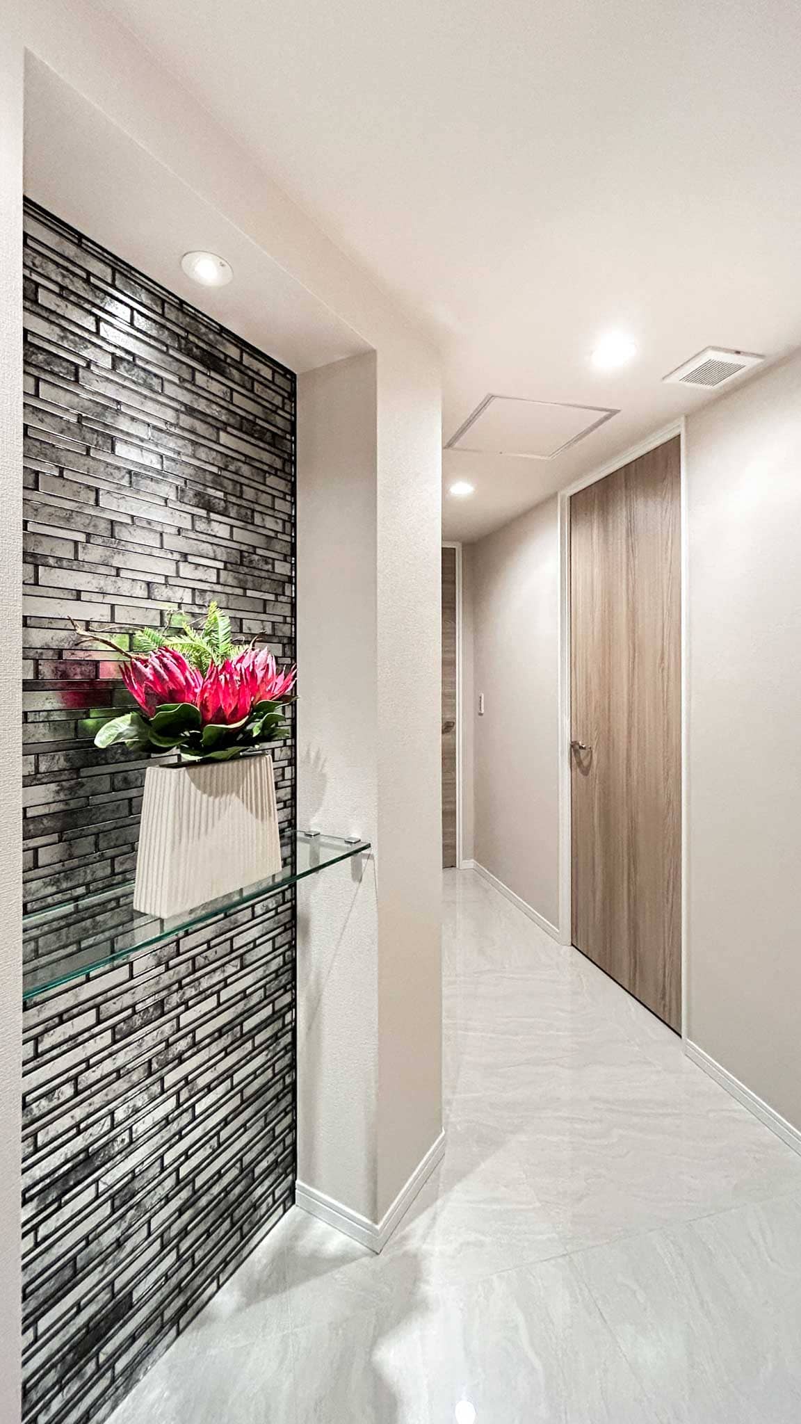 ゆったりとした玄関なので、荷物を持っていたり、ベビーカーやスーツケースをひいていても出入りがしやすそうです。入って右側には収納スペースが造られています。また、反対側の壁面には鏡が設置されているので、出かける際に全身のコーディネートをチェックすることができますよ。さらに、廊下にはカウンターが造られており、自分好みに小物などを飾ることができます。