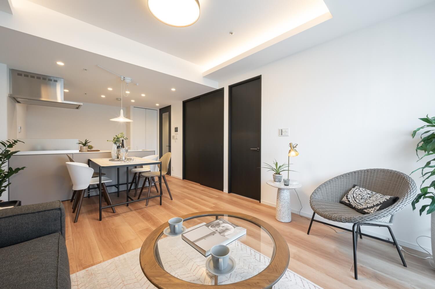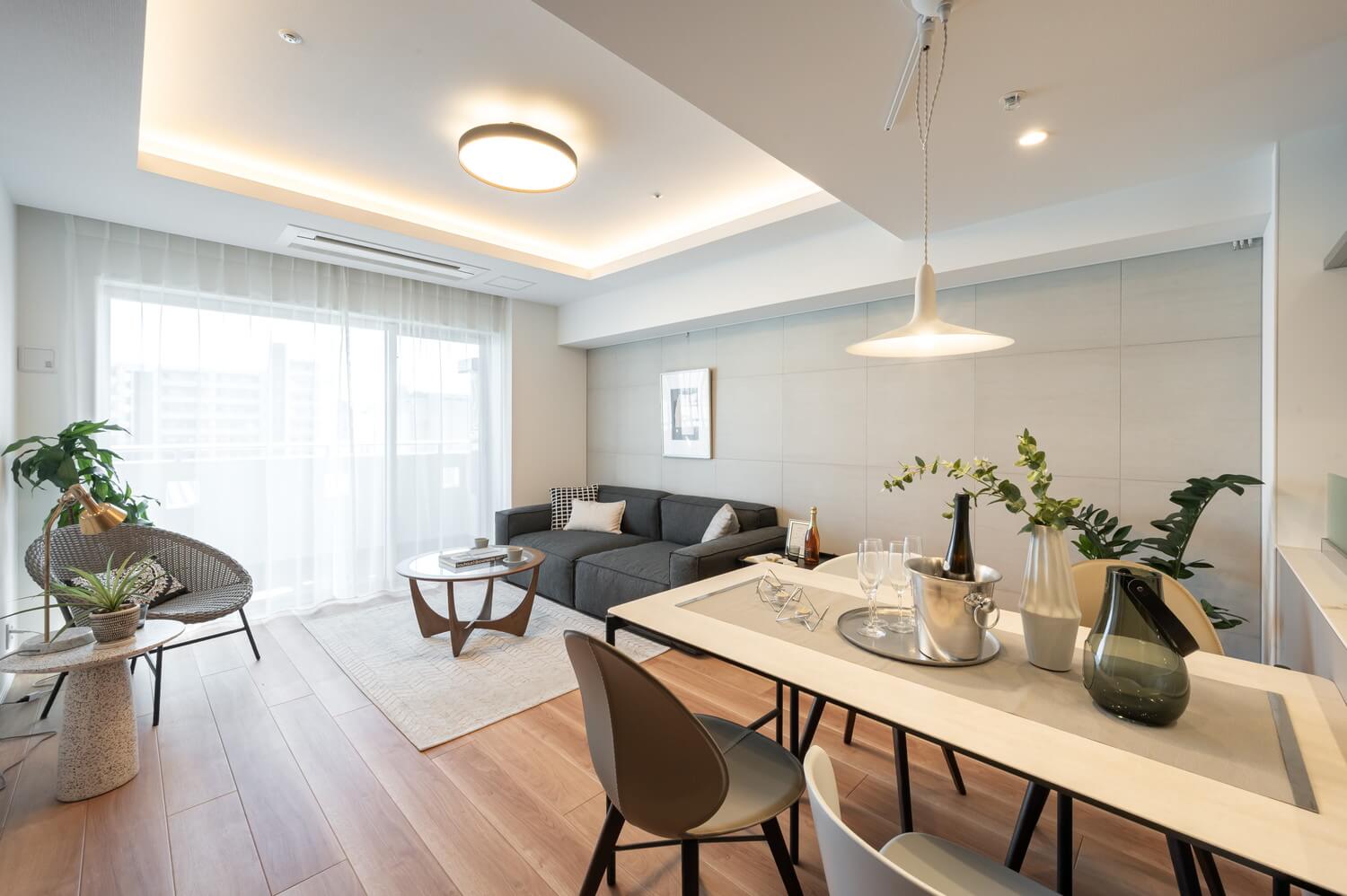 キッチンスペースを含め、約15.2帖のLDK。家族でゆったり過ごせる広さです。タイル貼りのアクセントウォールがお洒落な雰囲気。ピクチャーレールが設置されていて、壁にキズをつけずにアートや写真が飾れます。方角は朝の光が心地よい東向き。窓も大きく開放感があります。