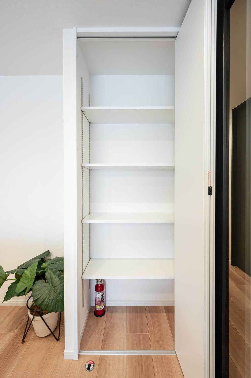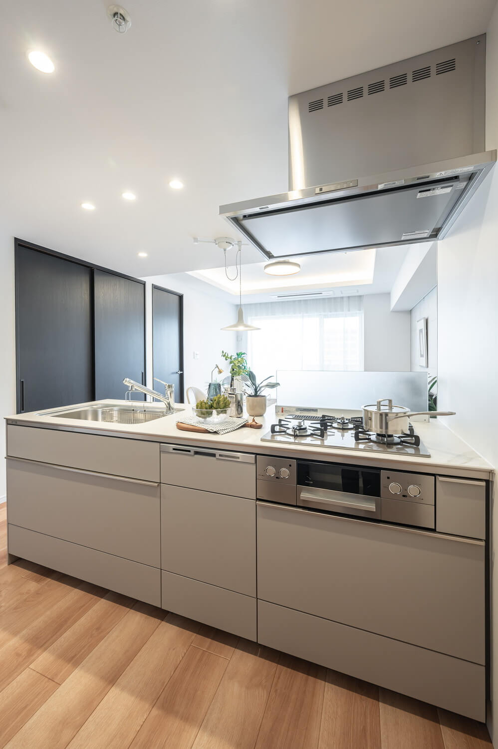 リビングダイニングが見渡せる開放的なオープンキッチン。家族やゲストとコミュニケーションが取りやすく、小さなお子さんがいるご家庭では子どもの姿も見守れます。料理が捗る3口ガスコンロ、家事の時短に心強い食洗機付き。キッチンの近くには収納スペースも備わっているので、パントリーとしても活用できそうです。
