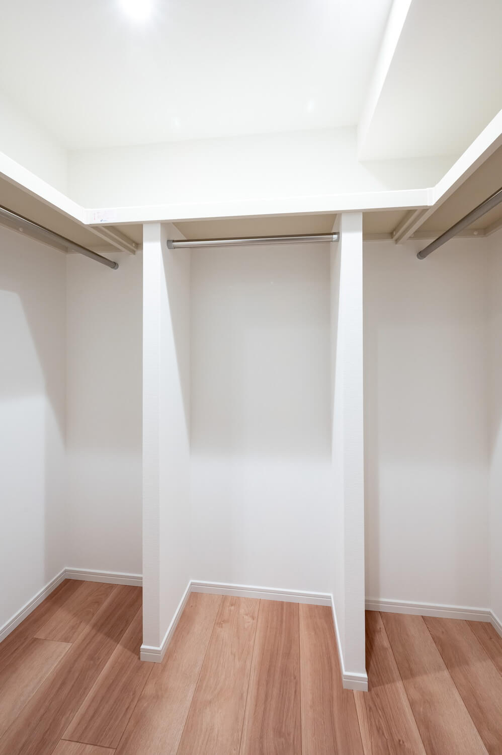 約6.9帖の洋室1。3つの洋室で一番広いお部屋です。廊下に面した独立性の高い空間で、自分時間をゆっくりと過ごせます。WIC(ウォークインクローゼット)は3方向にハンガーパイプが設置されていて、洋服がたくさん掛けられます。