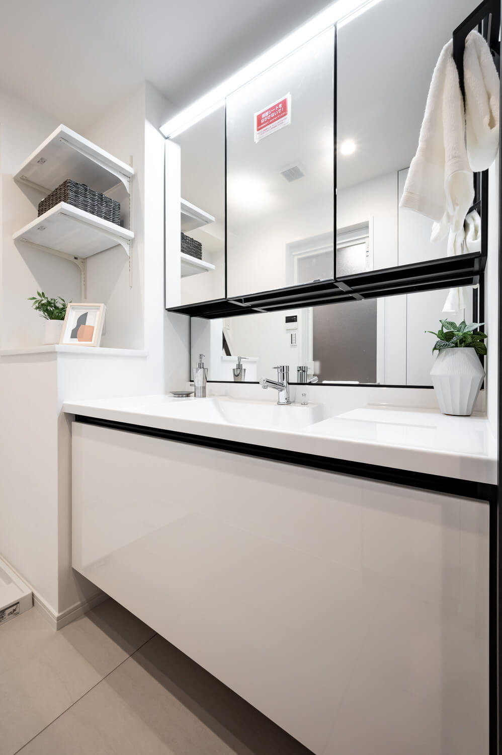 洗面化粧台は洗面まわりの小物がすっきり整頓できるミラーボックスや、モノの出し入れがしやすい引き出し式のキャビネット付きで使い勝手の良さもポイント。洗面台の左横にも可動棚が設置されています。