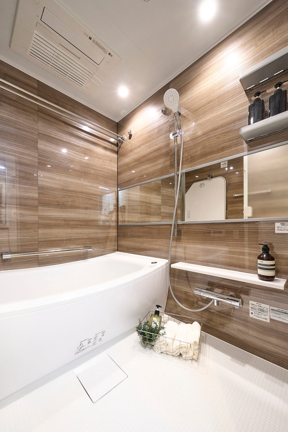 ウッド調であたたかみのある雰囲気のバスルーム。追い炊き機能の他、浴室換気乾燥機とランドリーパイプ2本付きで雨の日や冬場の洗濯にも困りません。