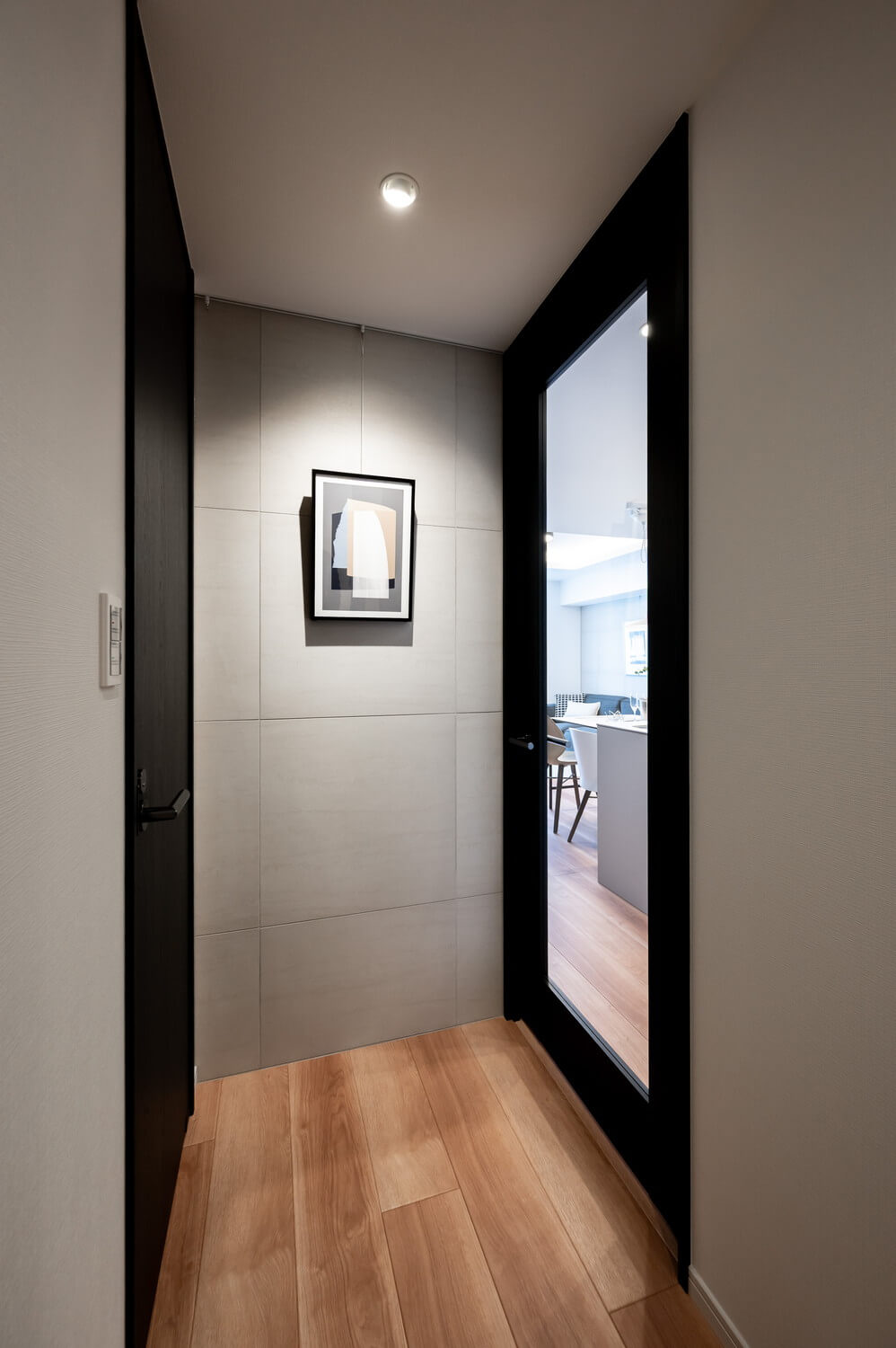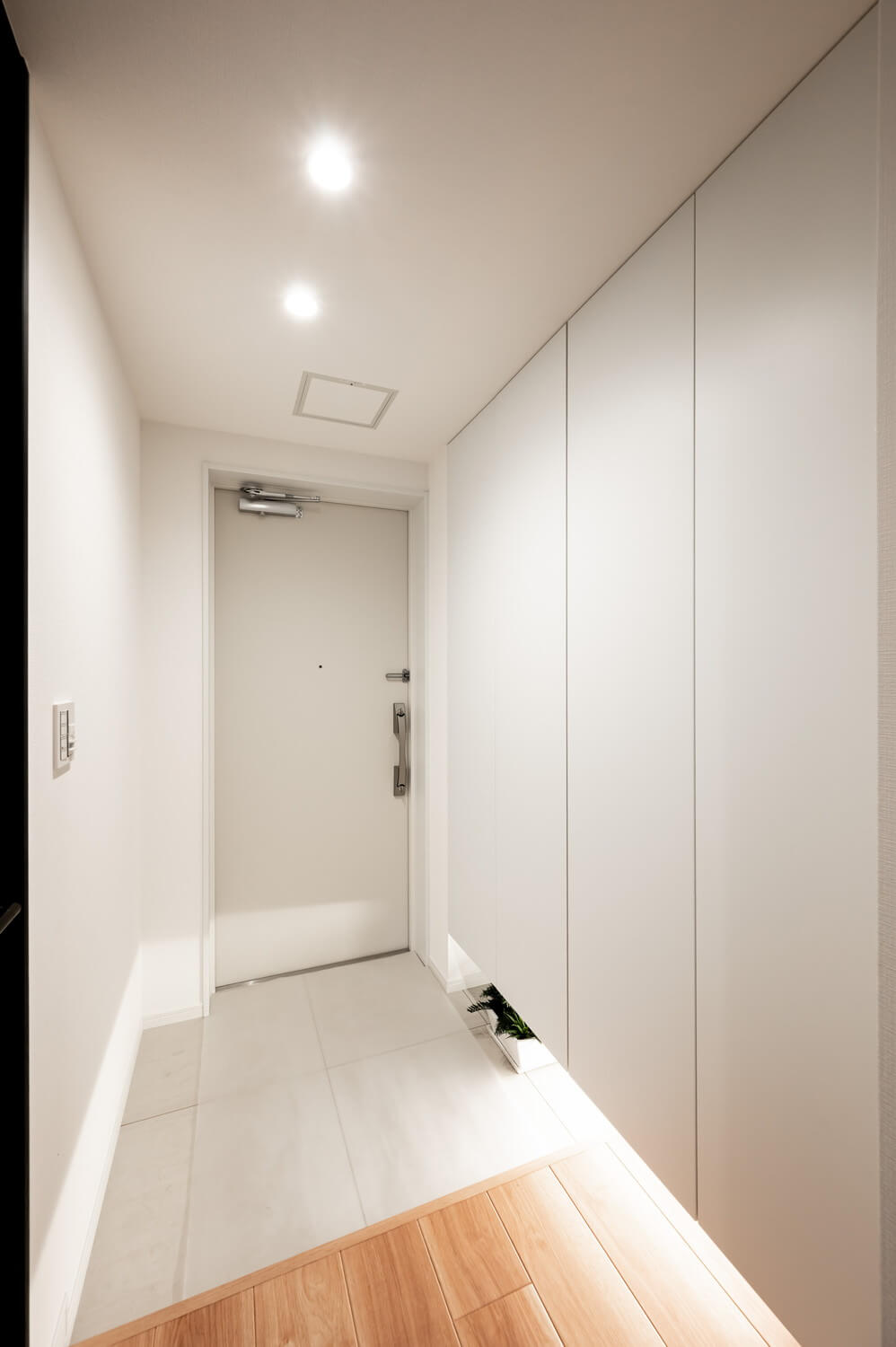 明るい印象を与えてくれるホワイトカラーで統一された玄関ホール。3枚扉のシューズボックスで靴がたっぷり収納できます。足元をやさしい光で照らしてくれるフットライトも付いています。廊下正面にはリビング同様、タイル貼りのアクセントウォールが施されていて、ピクチャーレールも付いています。アートを飾って空間に彩りをプラスできますね。